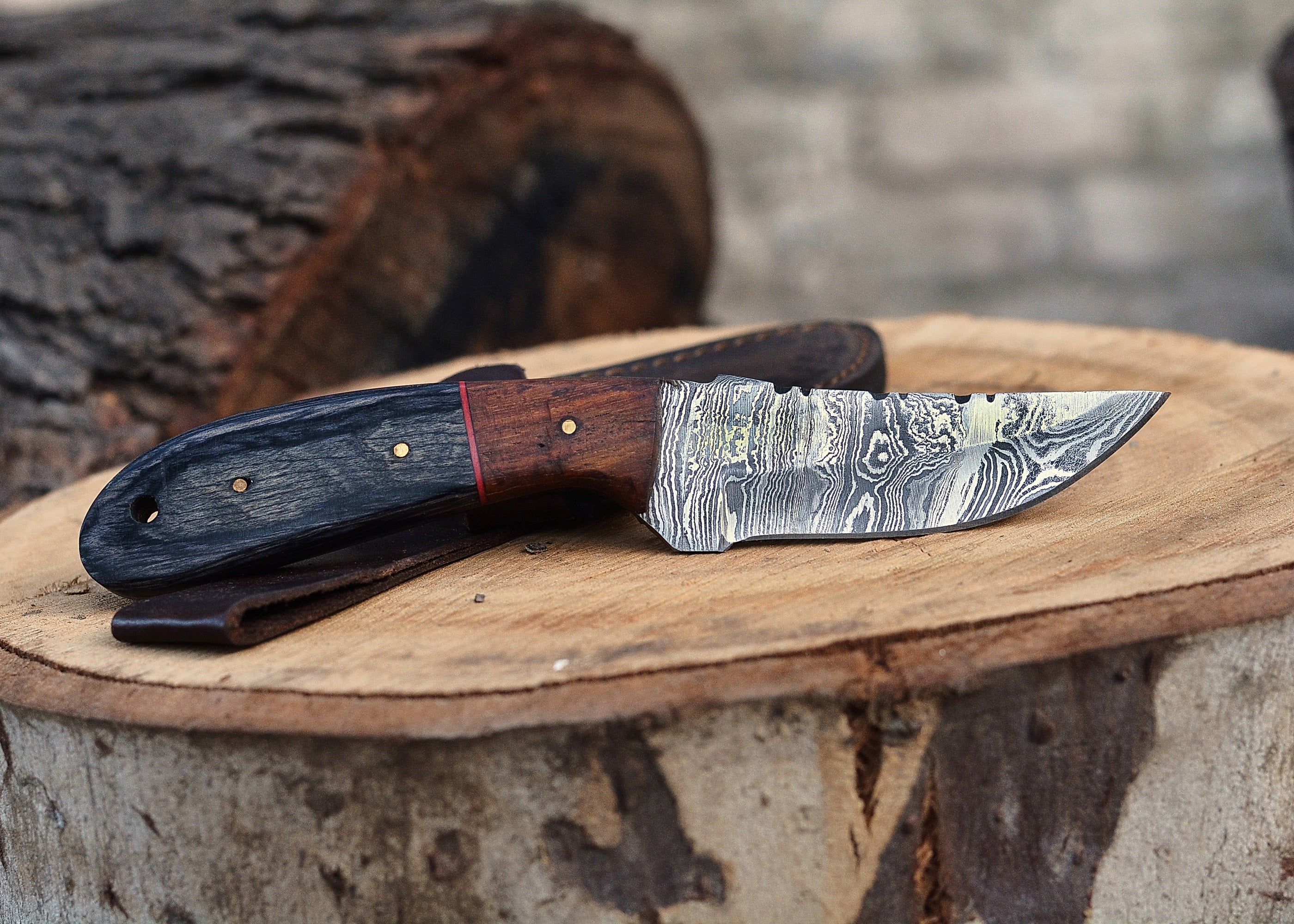 Crafted from premium Damascus steel and reinforced hardwood materials, this knife is built to withstand outdoor challenges.